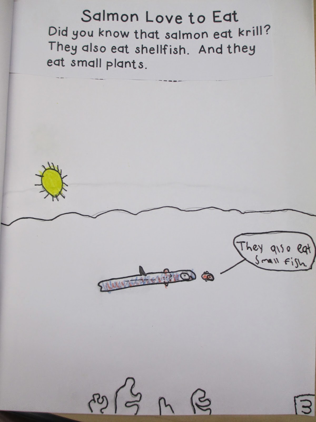 Em and I have had long conversations about final copies of writing pieces. Do your firsties like to "publish" their pieces? Our firsties LOVE writing their pieces, but rewriting them....notsomuch. The time has been put in and they are not willing to redo what has been done. So for this writing piece, students wrote/drew pictures/revised, edited and then we typed them up. After that students only had to cut and paste their words onto blank white pages. I liked doing it this way because it gave them the power to choose where their words would go and what the book would look like. Once the words were in place, the illustrating began! Here are a few books. WARNING... there are a lot of pictures, but I wanted to show you the differences in our writers. The first book was one of my favs because he wrote about Salmon. What firstie chooses Salmon to write about???!!!??? This friend. :) His lead and fun fact are fantastic!